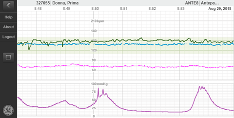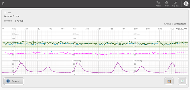 Note: Images of the fetal strip depict the US paper speed (3 cm/min). If your site uses European paper speed (1 cm/min) for their fetal monitors, the examples shown below will feel stretched.