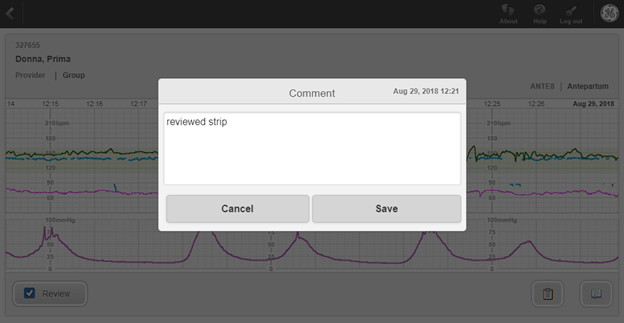 The Web Annotation Comment screen can be used to enter a text note to a patient’s fetal strip from within Centricity Perinatal Web, if configured.